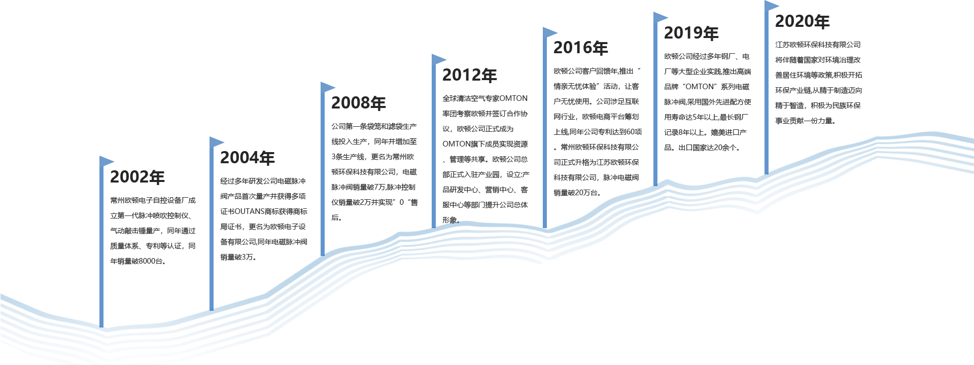 江蘇歐頓環保科技有限公司是一家專業從事袋式除塵器配件研發、生產、銷售和環保技術相關的企業。公司通過國家相關產品認證企業、質量等認證企業,公司擁有袋式除塵器技術研發中心、實驗中心、檢測中心等配套實施。我們以全球科技發展為導向,2014年通過與國外知名工業清潔空氣凈化專業企業進行合作,引進先進的空氣凈化技術和先進的產生、管理模式,投入大量資金對電磁脈沖閥膜片和除塵濾料產品進行研發,并獲得顯著成果,使得歐頓產品在國內市場占有一席之地,產品質量媲美國外產品,使得歐頓公司在袋式除塵行業起到跨越性作用。我們的產品包括電磁脈沖閥、脈沖噴吹控制儀、除塵濾袋、除塵袋籠、除塵器專用氣缸、專用配件、電氣控制柜及過濾筒、氣動助流產品等。其袋式除塵產品廣泛應用于電力、冶金、建材、垃圾焚燒、化工等行業。在過去的數年里,公司的產品和服務得到了市場的認可及肯定,產品出口到數十個國家。
